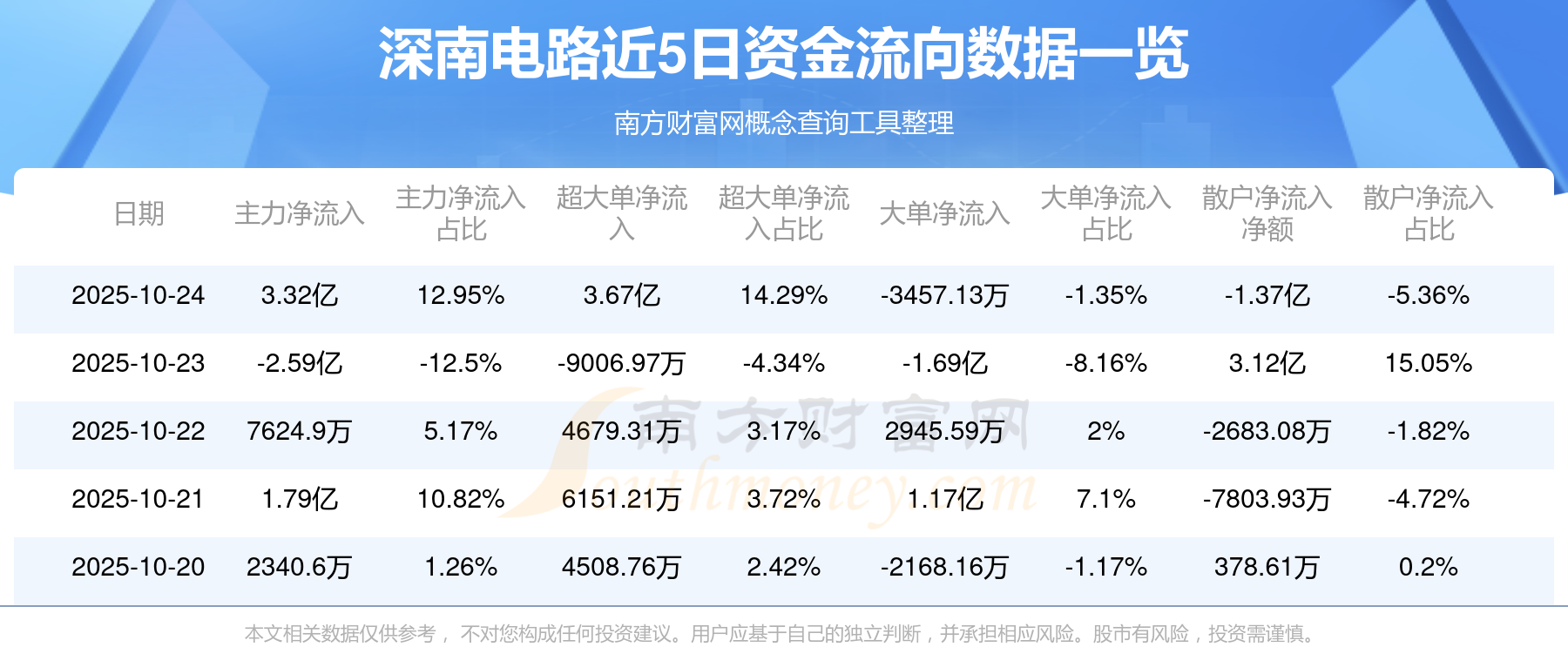 10月24日消息,深南电路10月24日主力资金净流入3.32亿元,超大单资金净流入3.67亿元,大单资金净流出3457.13万元,散户资金净流出1.37亿元。