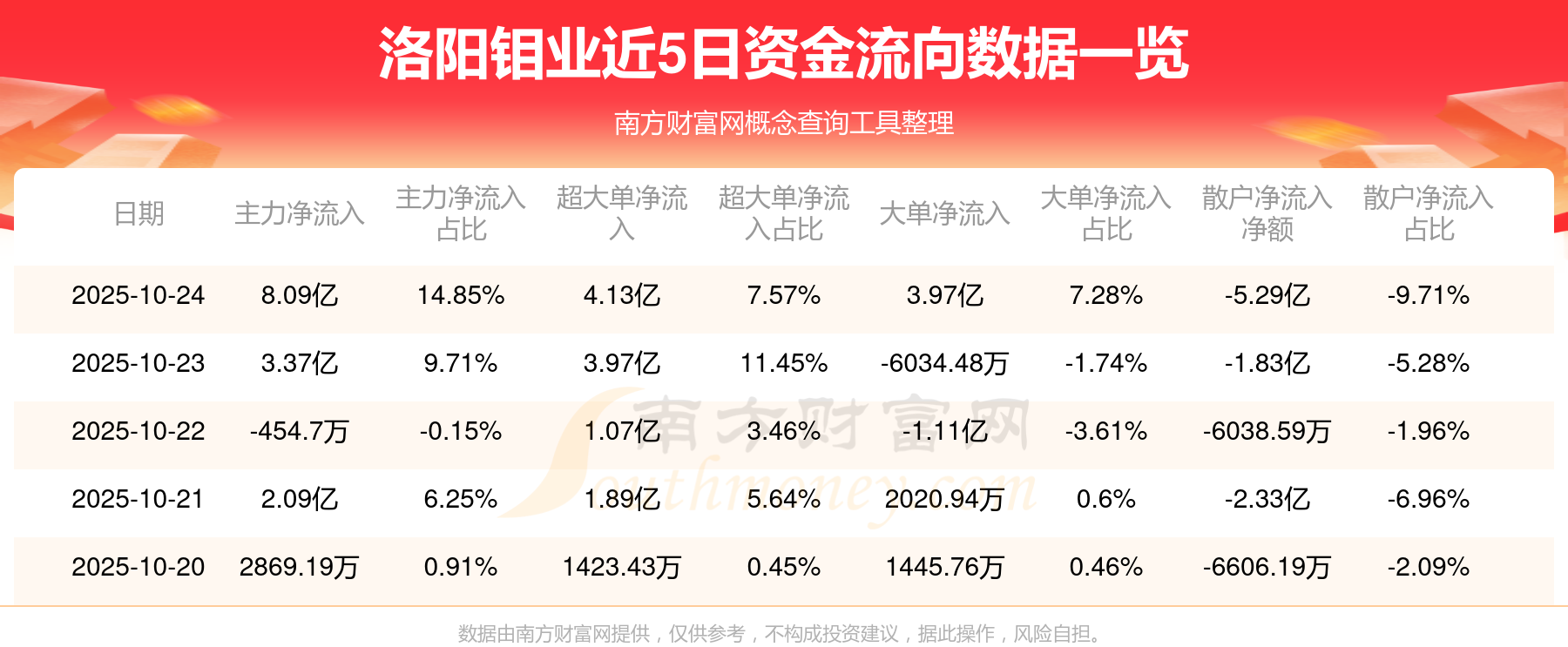10月24日消息,洛阳钼业10月24日主力资金净流入8.09亿元,超大单资金净流入4.13亿元,大单资金净流入3.97亿元,散户资金净流出5.29亿元。