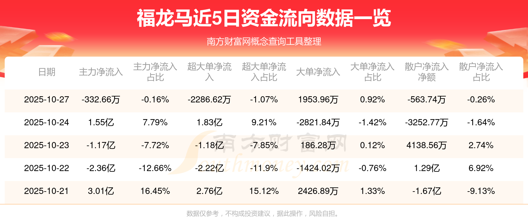 10月27日消息,福龙马主力资金净流出332.66万元,超大单资金净流出2286.62万元,散户资金净流出563.74万元。