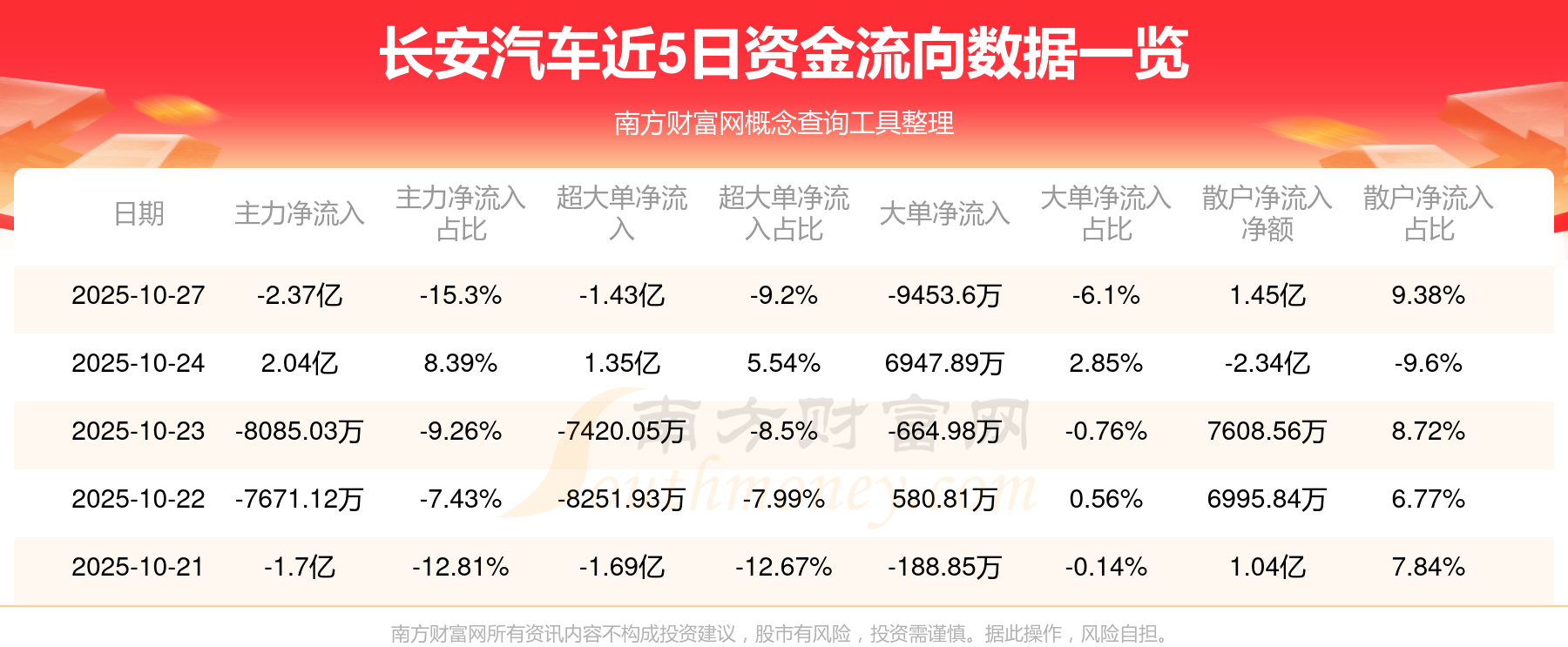 10月27日消息,长安汽车主力净流出2.37亿元,超大单净流出1.43亿元,散户净流入1.45亿元。