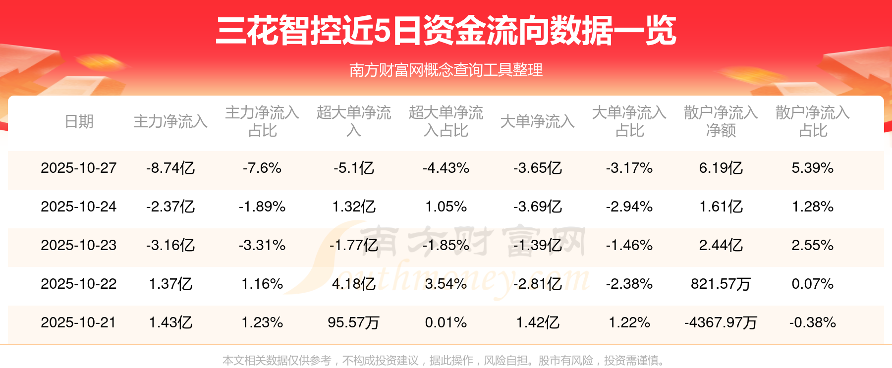 10月27日消息,三花智控10月27日主力净流出8.74亿元,超大单净流出5.1亿元,大单净流出3.65亿元,散户净流入6.19亿元。