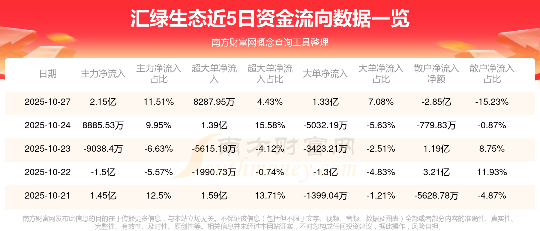 10月27日消息,汇绿生态主力资金净流入2.15亿元,超大单资金净流入8287.95万元,散户资金净流出2.85亿元。