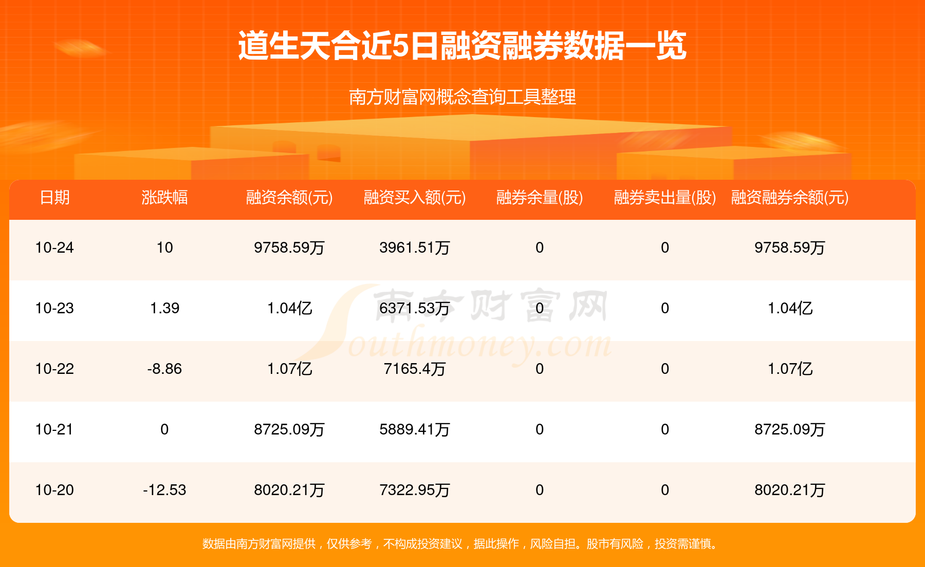 10月24日道生天合融券信息显示,融资方面,当日融资买入3961.51万元,融资偿还4606.18万元,融资净买额-644.68万元。近5日融资融券数据一览见下表: