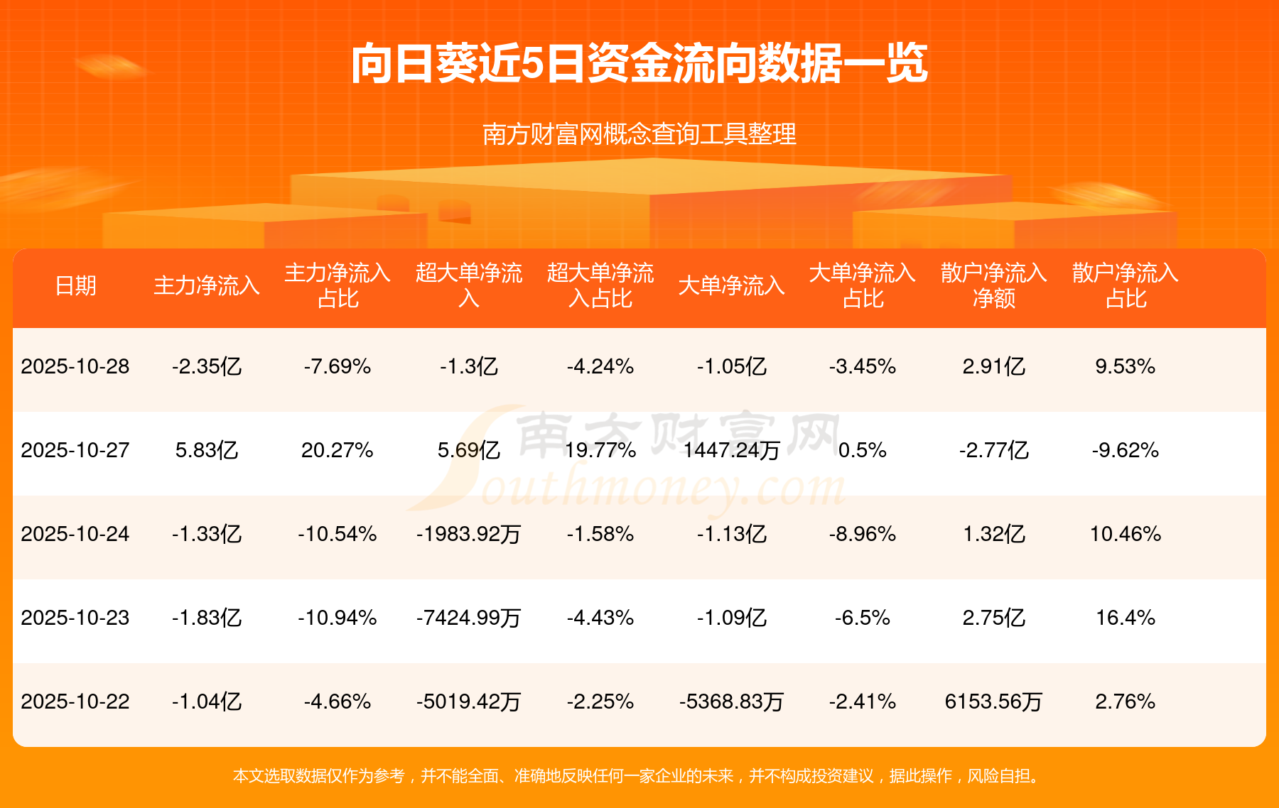 10月28日消息,向日葵10月28日主力资金净流出2.35亿元,超大单资金净流出1.3亿元,大单资金净流出1.05亿元,散户资金净流入2.91亿元。