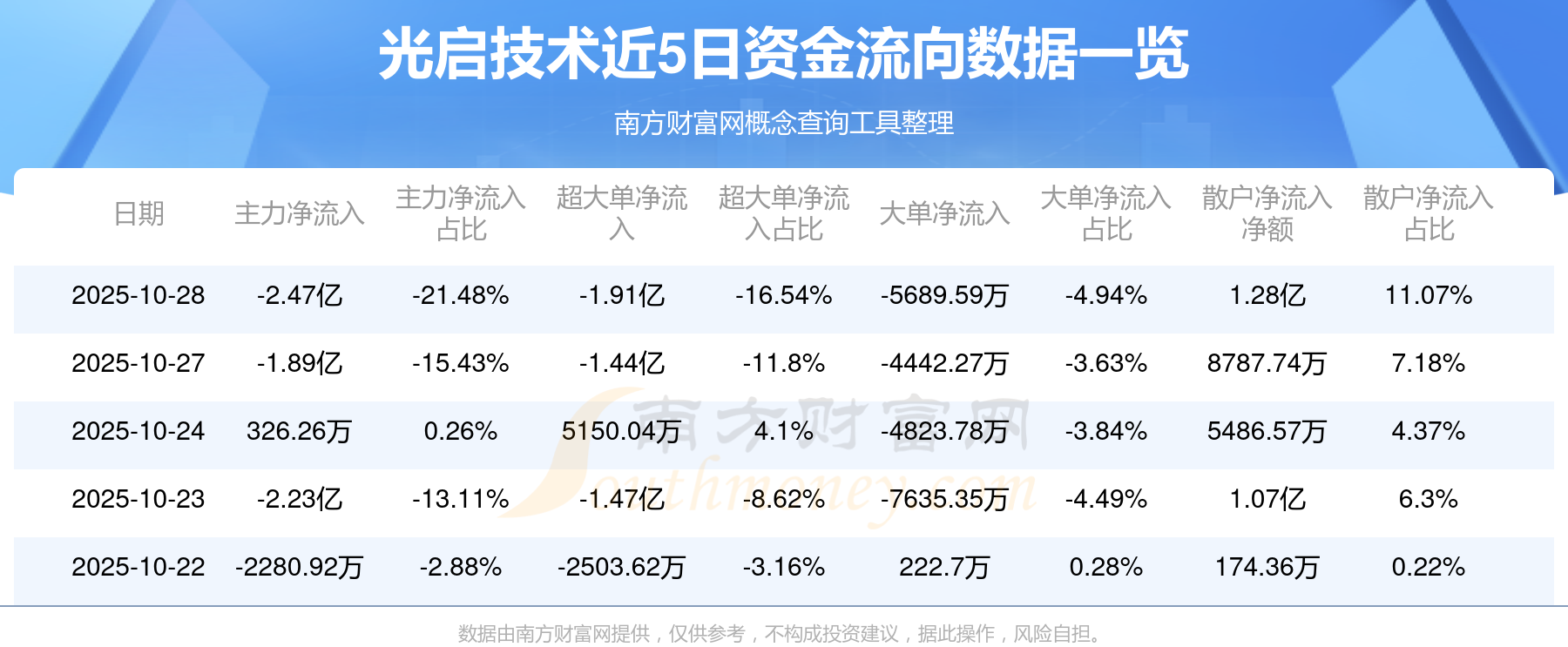 10月28日消息,光启技术10月28日主力净流出2.47亿元,超大单净流出1.91亿元,大单净流出5689.59万元,散户净流入1.28亿元。