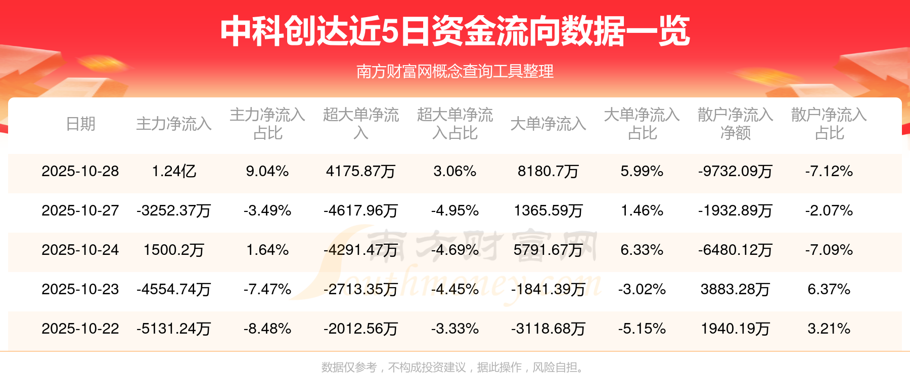 10月28日消息,中科创达主力资金净流入1.24亿元,超大单资金净流入4175.87万元,散户资金净流出9732.09万元。