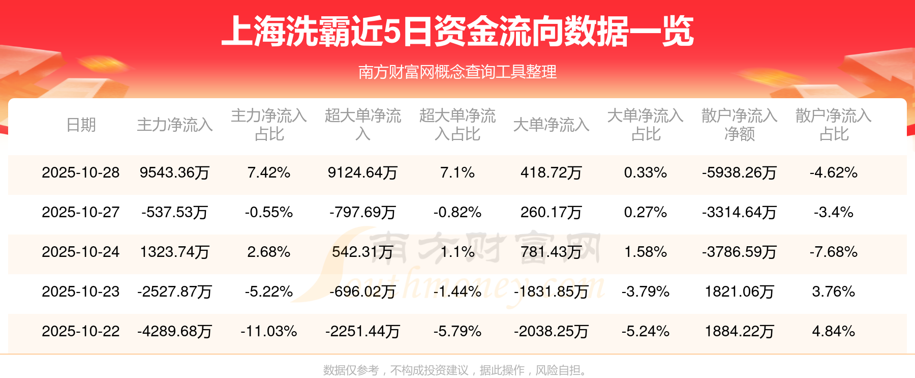10月28日消息,上海洗霸10月28日主力资金净流入9543.36万元,超大单资金净流入9124.64万元,大单资金净流入418.72万元,散户资金净流出5938.26万元。
