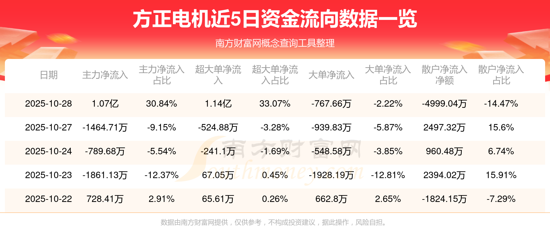 10月28日消息,方正电机主力净流入1.07亿元,超大单净流入1.14亿元,散户净流出4999.04万元。
