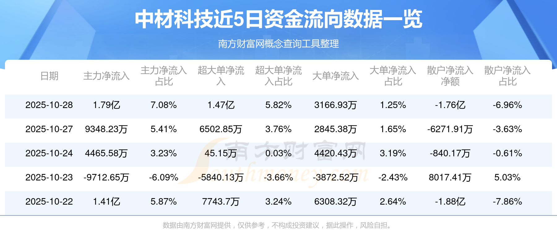 10月28日消息,中材科技主力资金净流入1.79亿元,超大单资金净流入1.47亿元,散户资金净流出1.76亿元。