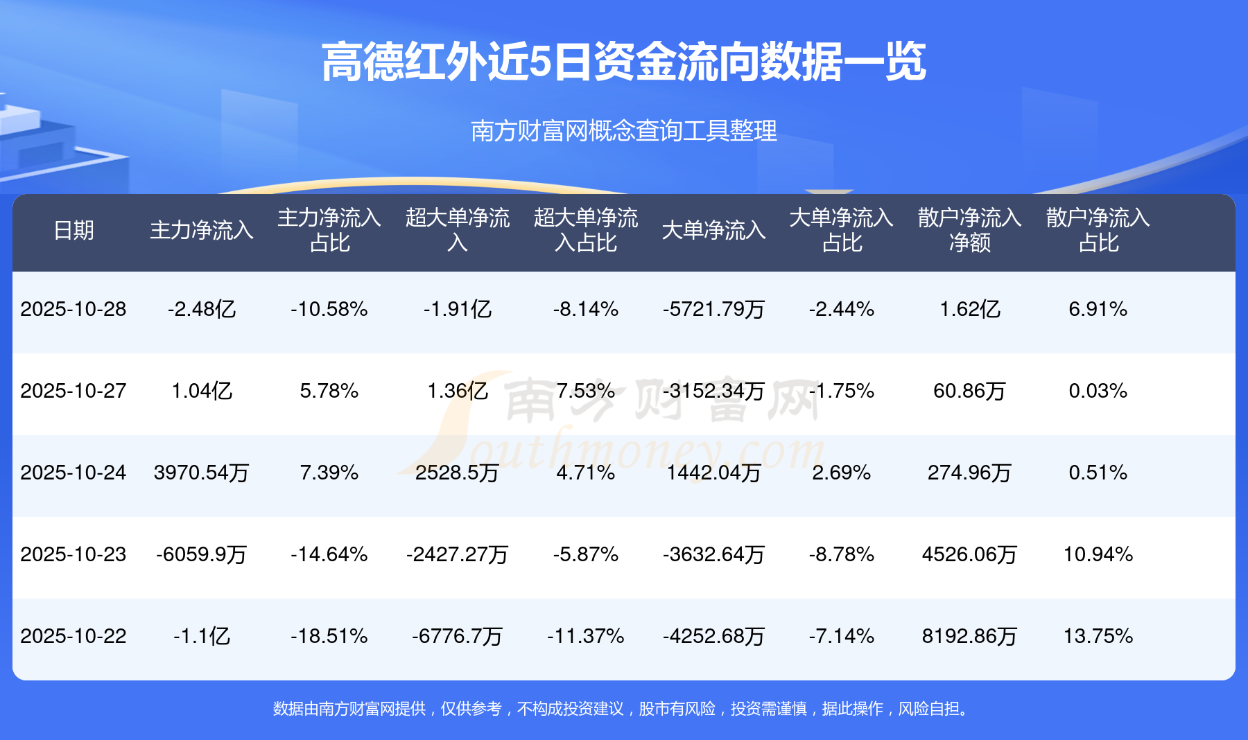 10月28日消息,高德红外10月28日主力资金净流出2.48亿元,超大单资金净流出1.91亿元,大单资金净流出5721.79万元,散户资金净流入1.62亿元。