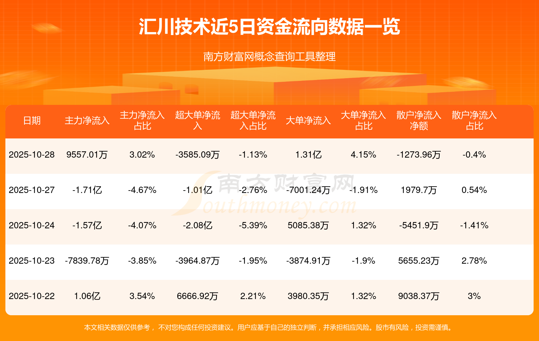 10月28日该股主力净流入9557.01万元,超大单净流出3585.09万元,大单净流入1.31亿元,中单净流出8283.05万元,散户净流出1273.96万元。