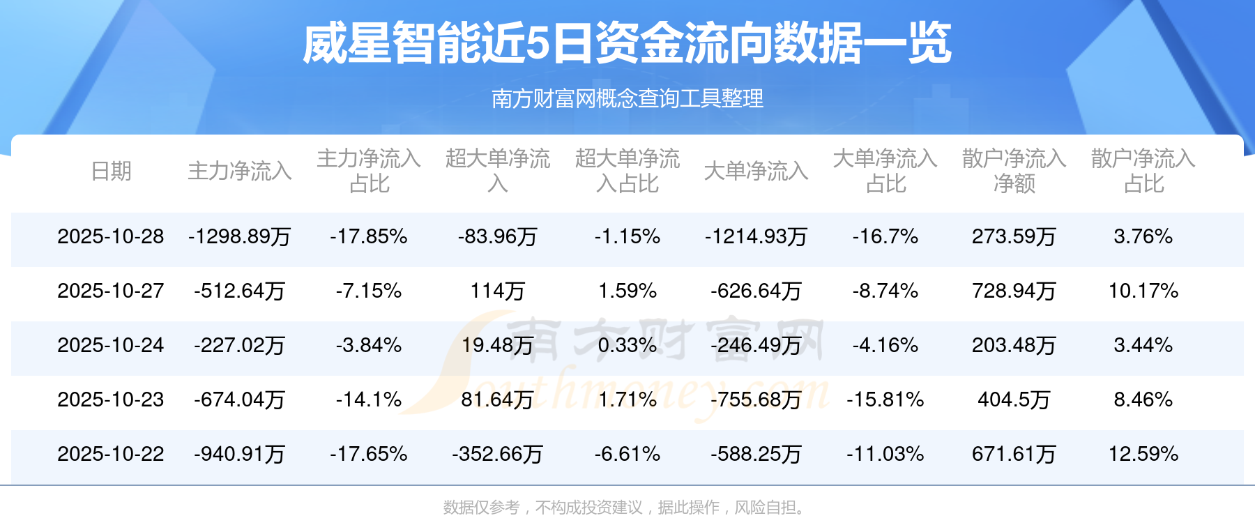 10月28日消息,威星智能10月28日主力净流出1298.89万元,超大单净流出83.96万元,大单净流出1214.93万元,散户净流入273.59万元。