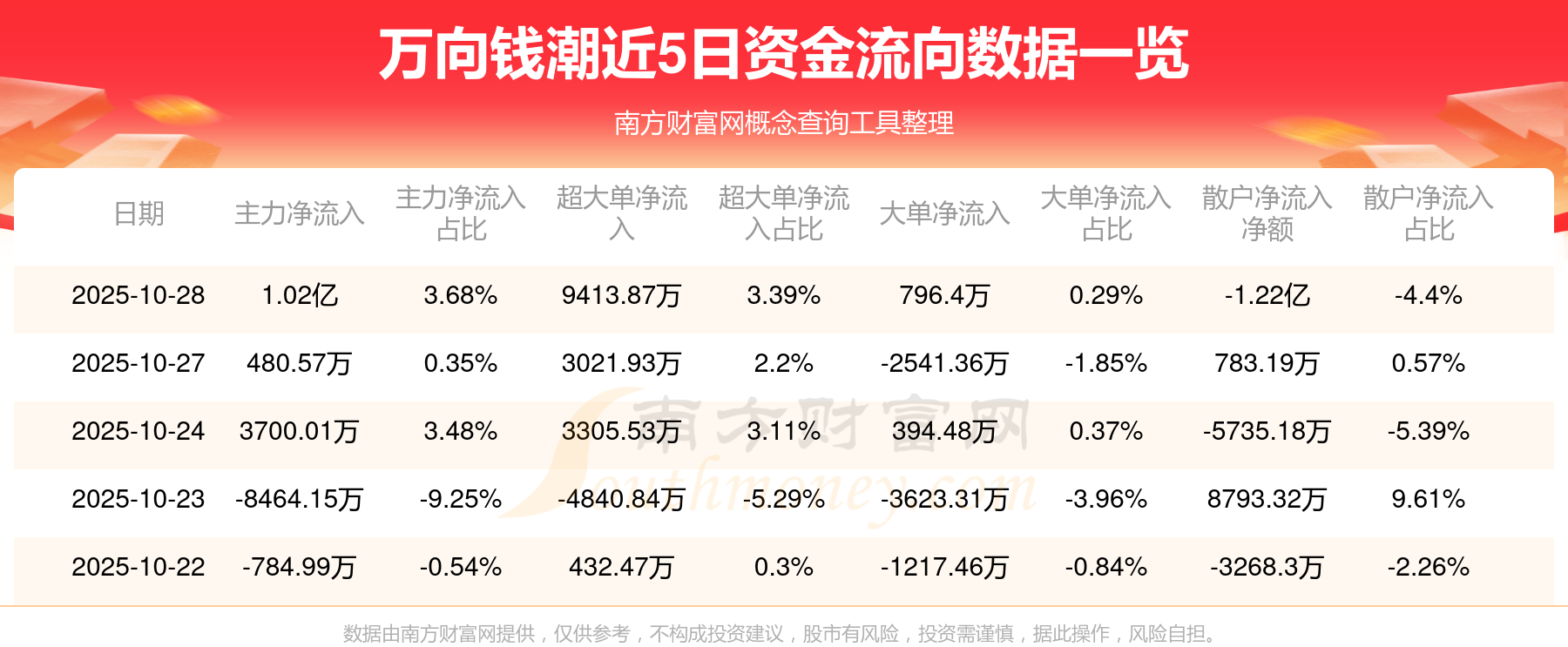 10月28日消息,万向钱潮10月28日主力净流入1.02亿元,超大单净流入9413.87万元,大单净流入796.4万元,散户净流出1.22亿元。
