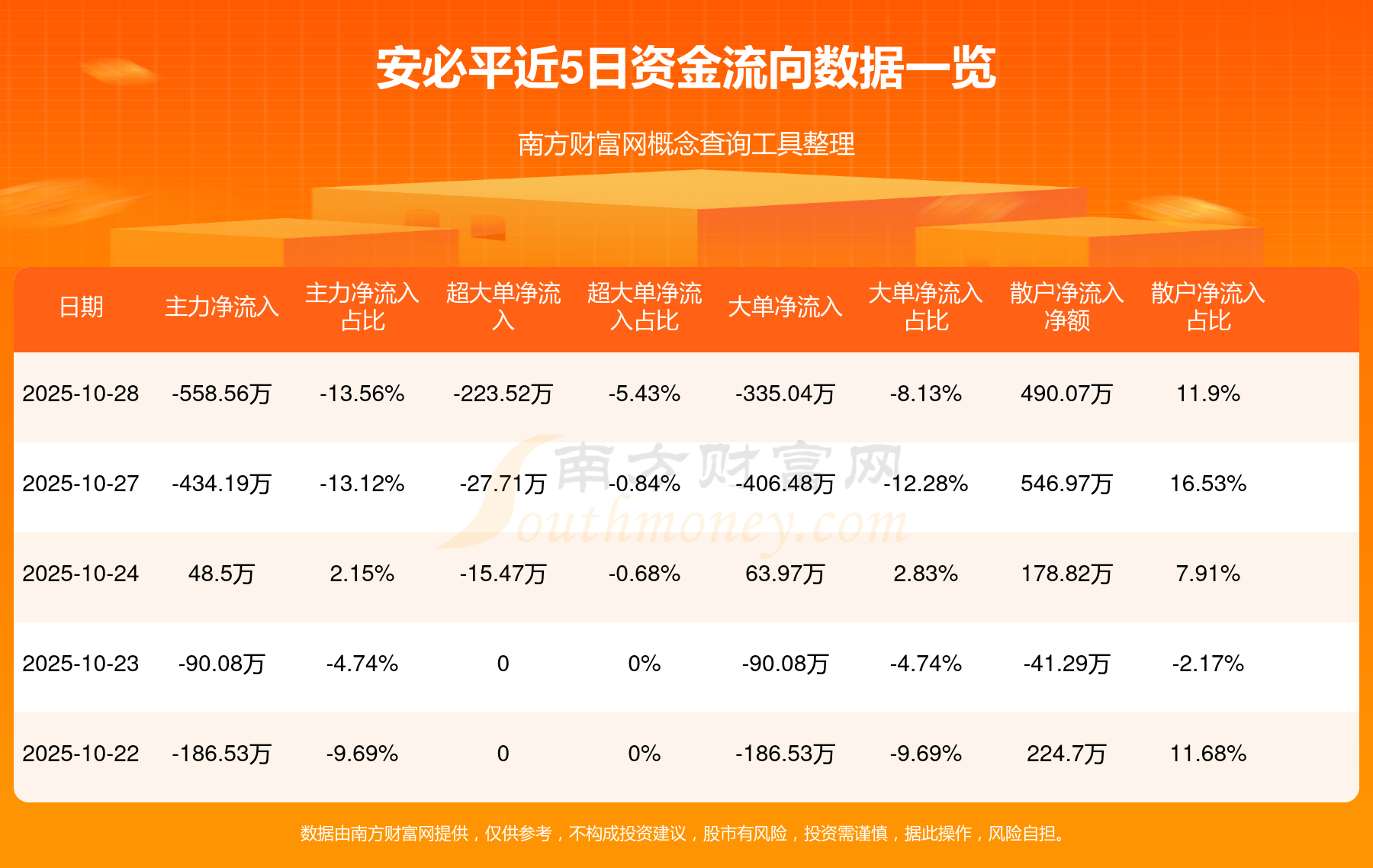 10月28日消息,安必平主力资金净流出558.56万元,超大单资金净流出223.52万元,散户资金净流入490.07万元。