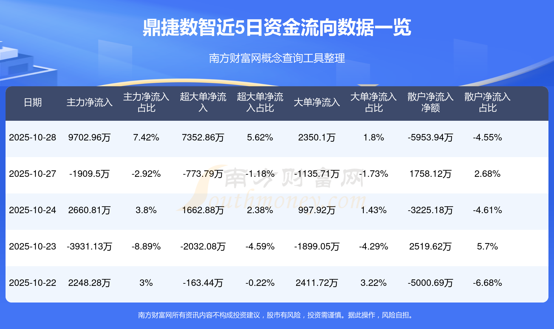 10月28日该股主力资金净流入9702.96万元,超大单资金净流入7352.86万元,大单资金净流入2350.1万元,中单资金净流出3749.01万元,散户资金净流出5953.94万元。