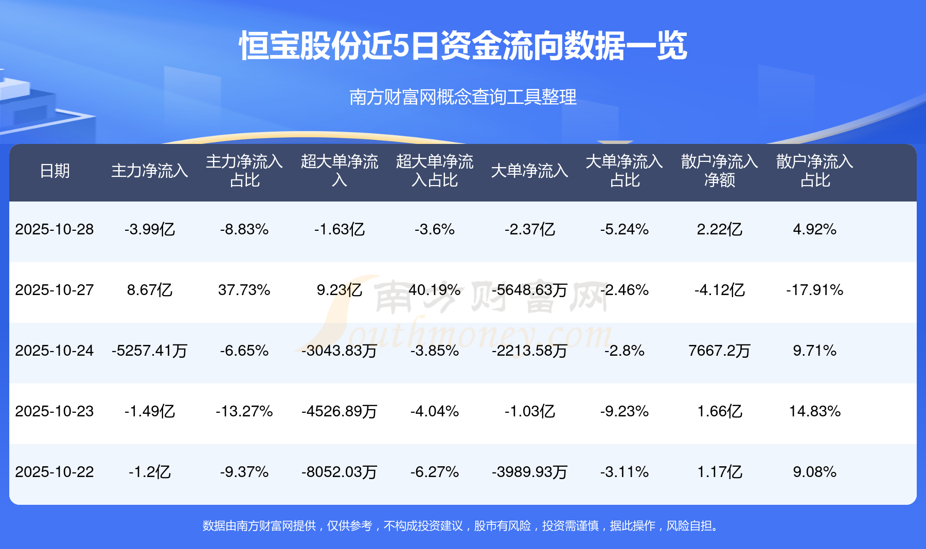 10月28日消息,恒宝股份主力资金净流出3.99亿元,超大单资金净流出1.63亿元,散户资金净流入2.22亿元。