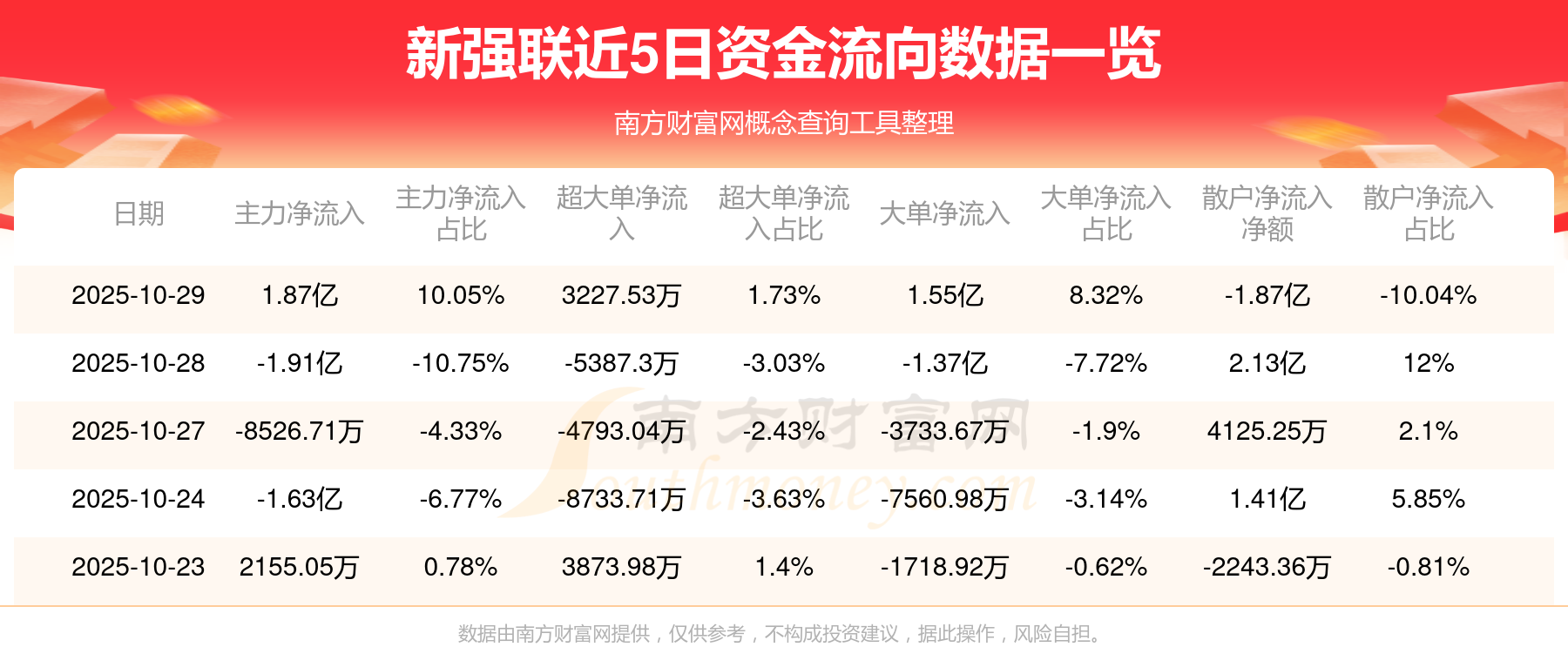10月29日消息,新强联10月29日主力净流入1.87亿元,超大单净流入3227.53万元,大单净流入1.55亿元,散户净流出1.87亿元。