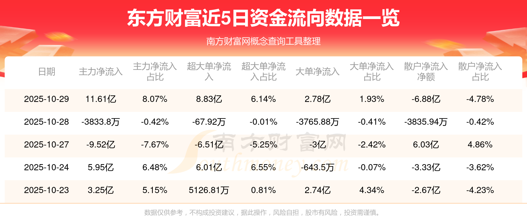 10月29日消息,东方财富10月29日主力资金净流入11.61亿元,超大单资金净流入8.83亿元,大单资金净流入2.78亿元,散户资金净流出6.88亿元。