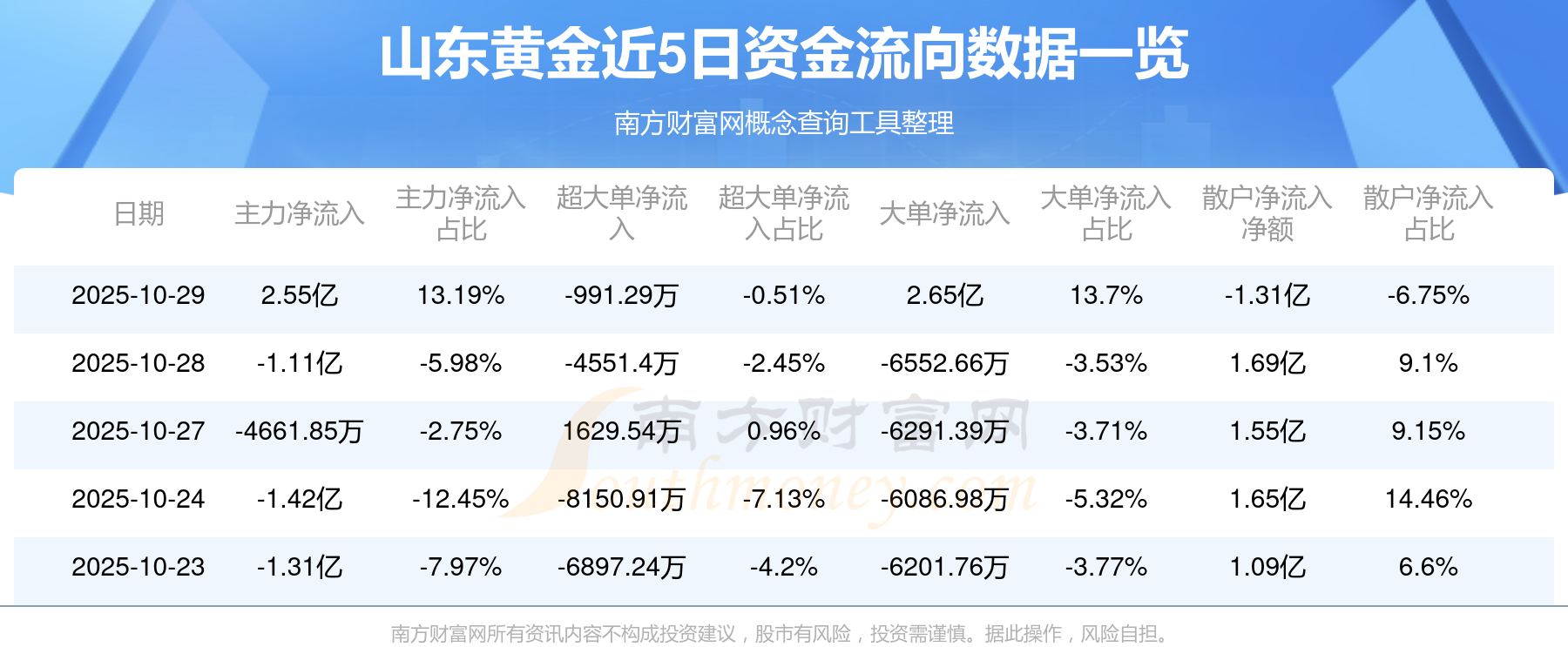 10月29日消息,山东黄金10月29日主力净流入2.55亿元,超大单净流出991.29万元,大单净流入2.65亿元,散户净流出1.31亿元。
