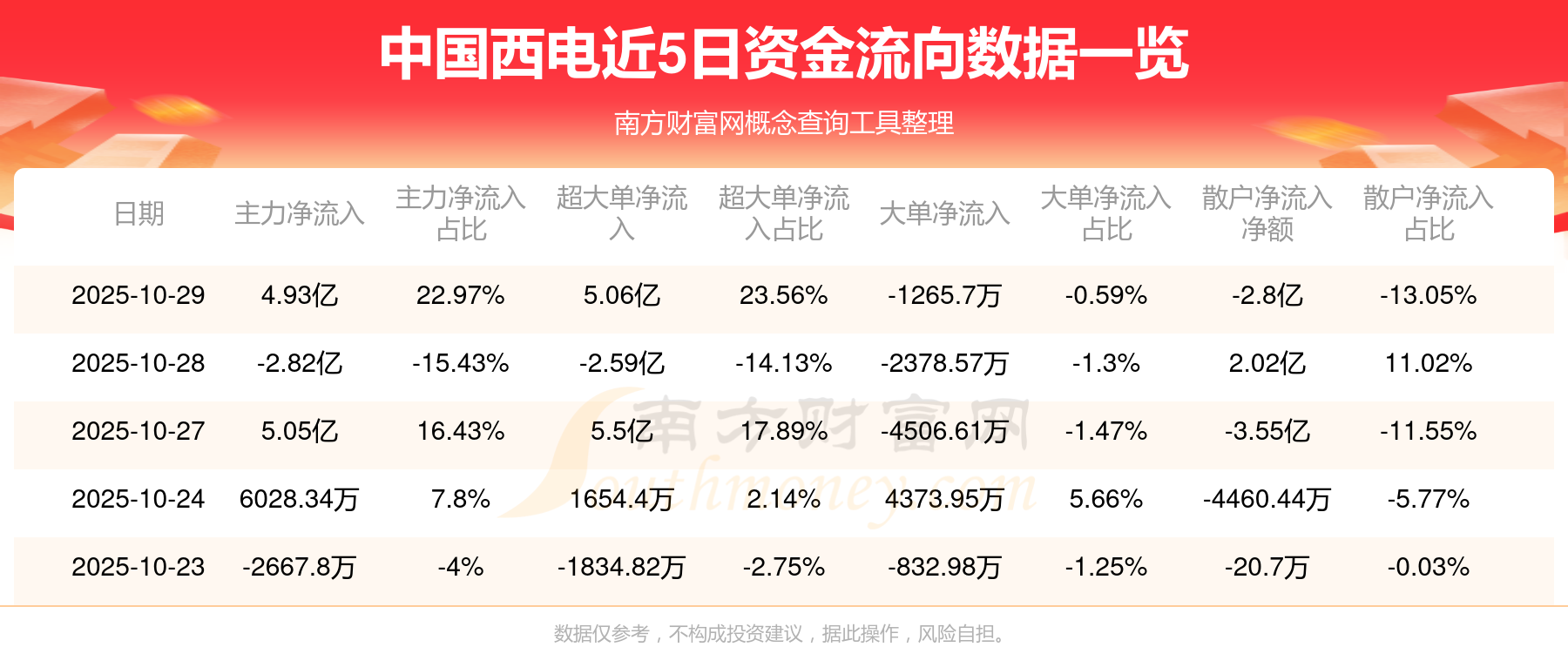 资金流向数据方面,10月29日主力资金净流流入4.93亿元,超大单资金净流入5.06亿元,大单资金净流出1265.7万元,散户资金净流出2.8亿元。