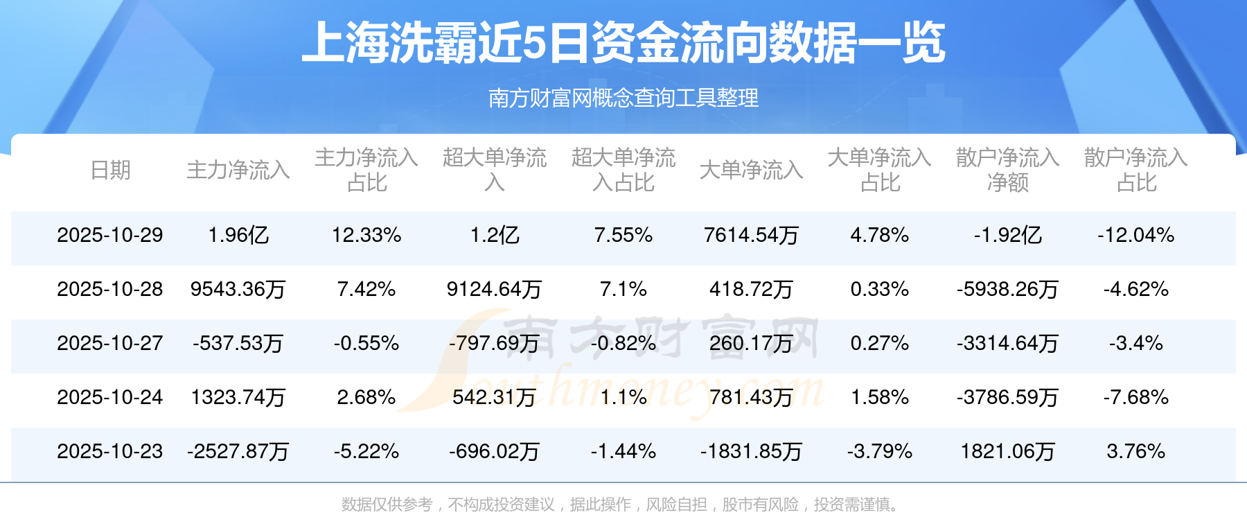 10月29日消息,上海洗霸资金净流入1.96亿元,超大单资金净流入1.2亿元,换手率10.04%,成交金额15.93亿元。