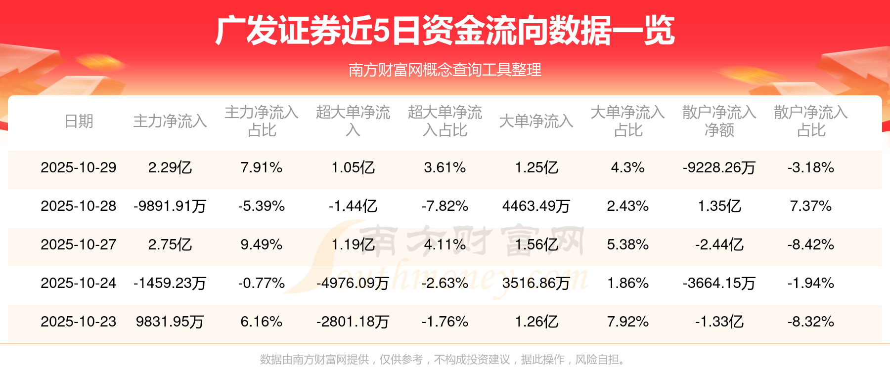 10月29日消息,广发证券资金净流入2.29亿元,超大单资金净流入1.05亿元,换手率2.08%,成交金额29.01亿元。