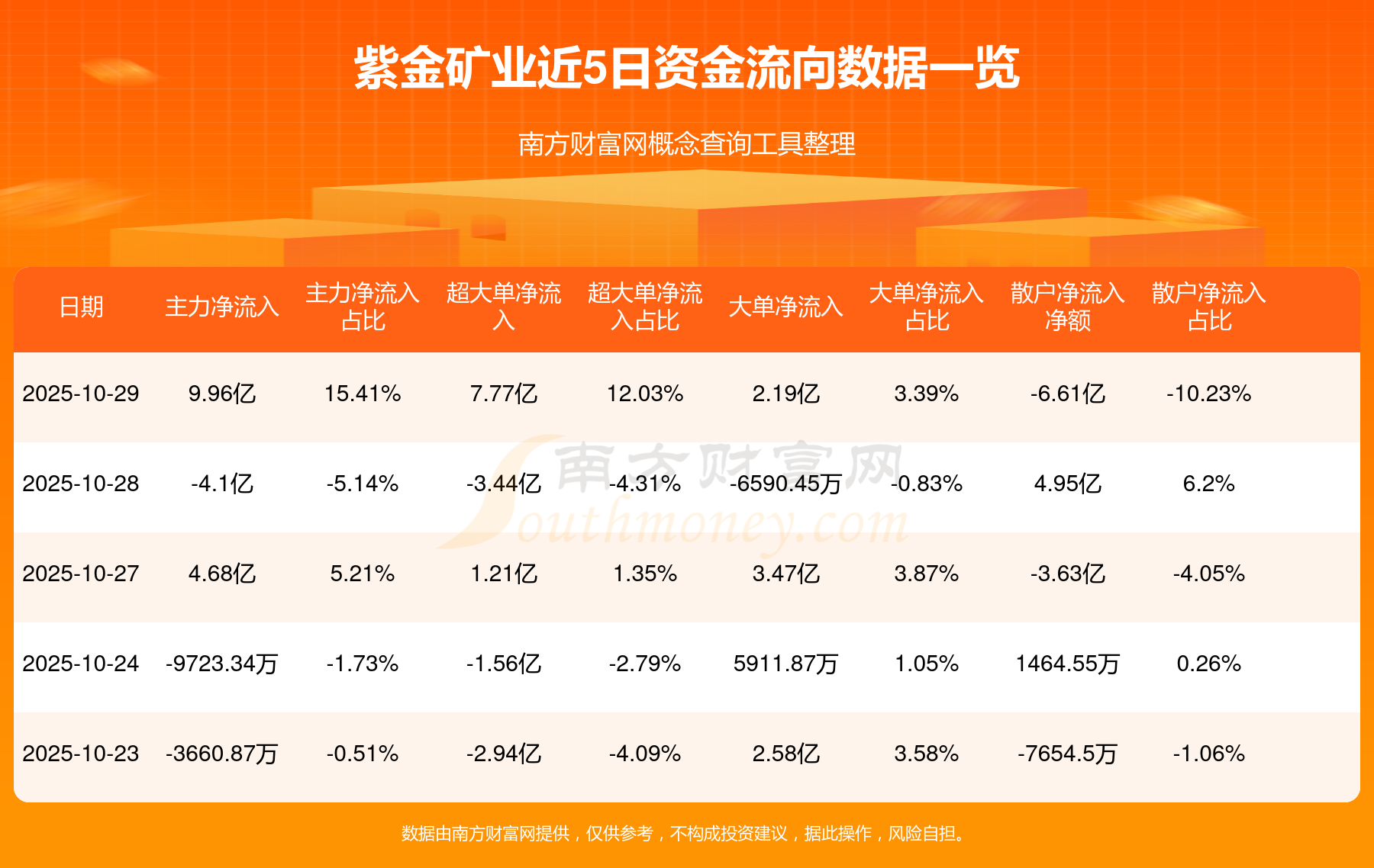 10月29日消息,紫金矿业主力净流入9.96亿元,超大单净流入7.77亿元,散户净流出6.61亿元。