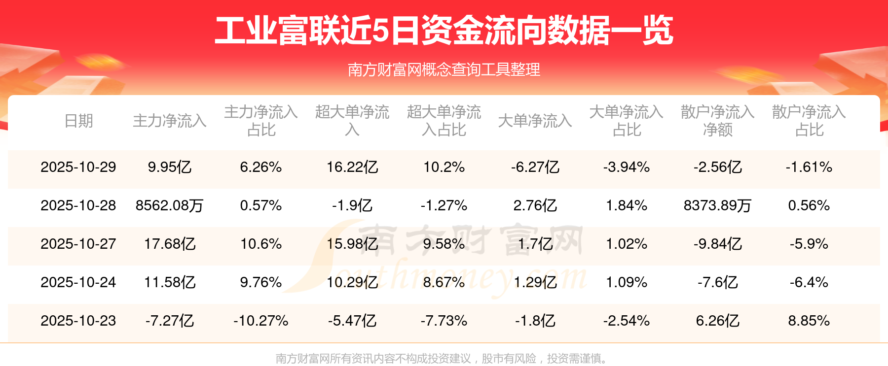 资金流向数据方面,10月29日主力资金净流流入9.95亿元,超大单资金净流入16.22亿元,大单资金净流出6.27亿元,散户资金净流出2.56亿元。