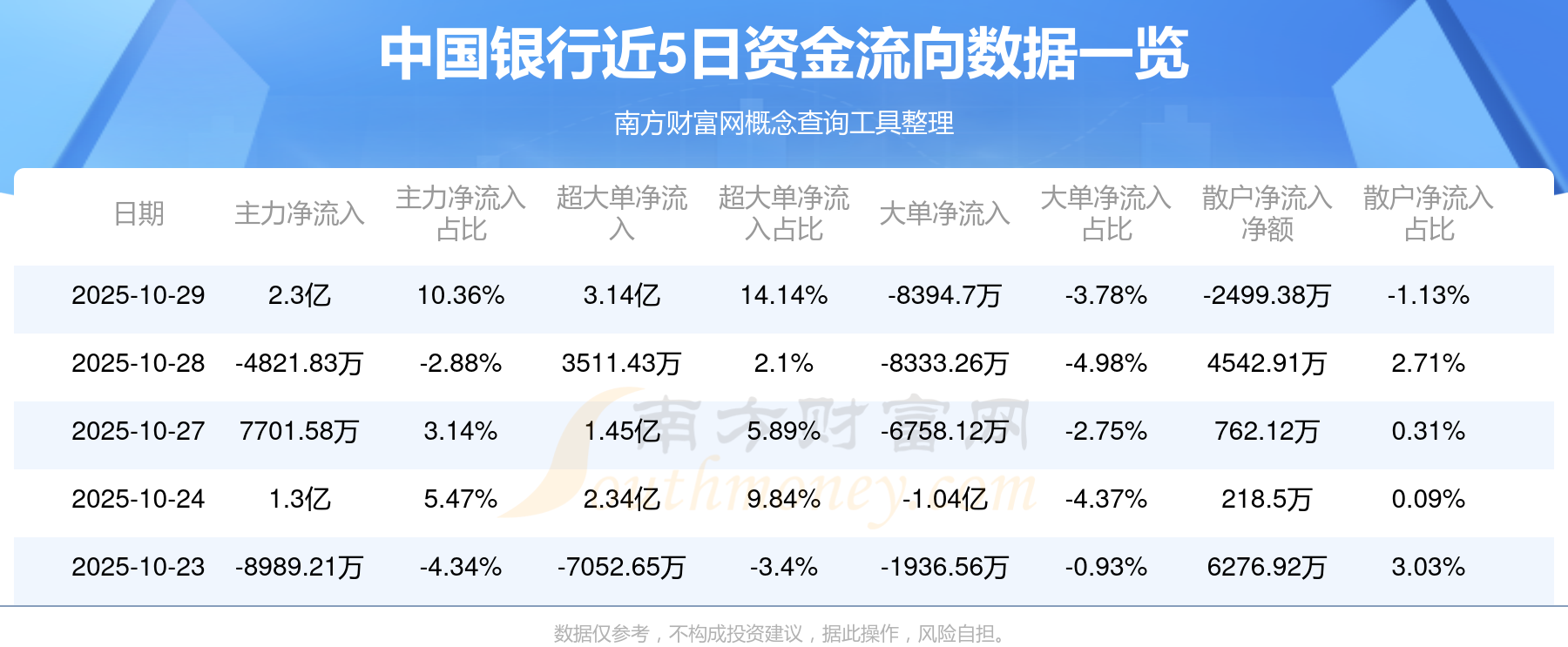 10月29日消息,中国银行10月29日主力资金净流入2.3亿元,超大单资金净流入3.14亿元,大单资金净流出8394.7万元,散户资金净流出2499.38万元。
