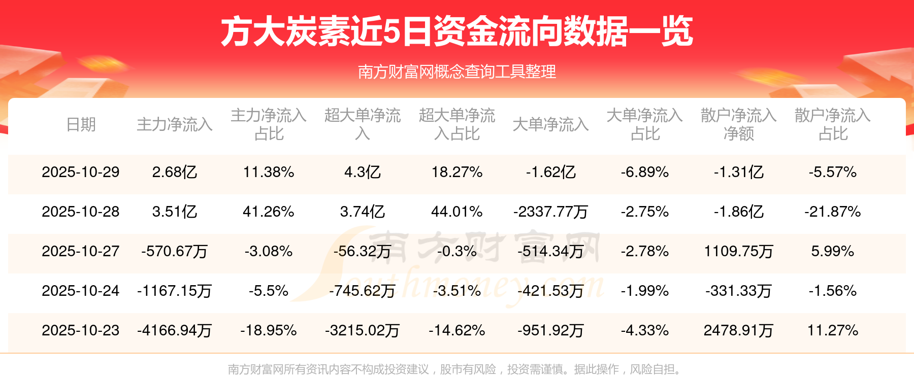 10月29日消息,方大炭素10月29日主力资金净流入2.68亿元,超大单资金净流入4.3亿元,大单资金净流出1.62亿元,散户资金净流出1.31亿元。