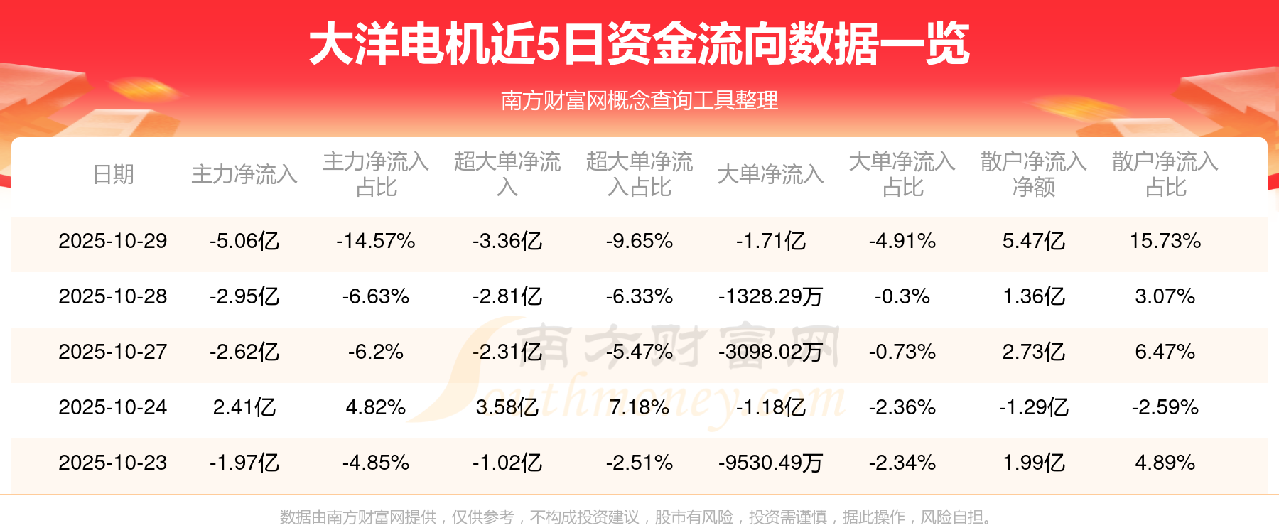 10月29日消息,大洋电机10月29日主力资金净流出5.06亿元,超大单资金净流出3.36亿元,大单资金净流出1.71亿元,散户资金净流入5.47亿元。