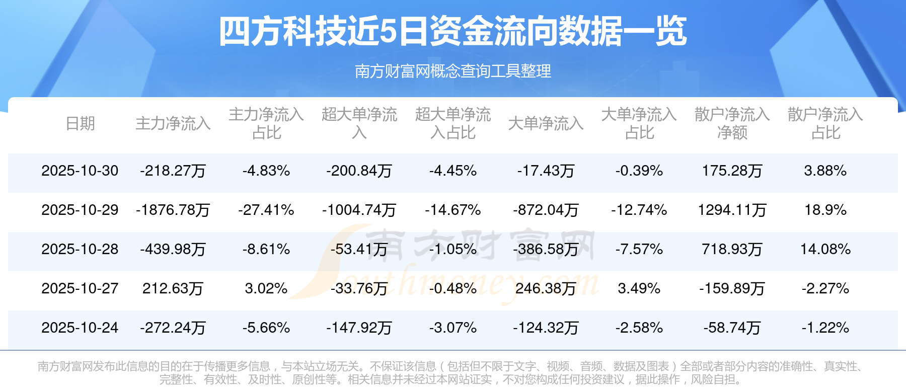 10月30日该股主力资金净流出218.27万元,超大单资金净流出200.84万元,大单资金净流出17.43万元,中单资金净流入42.99万元,散户资金净流入175.28万元。