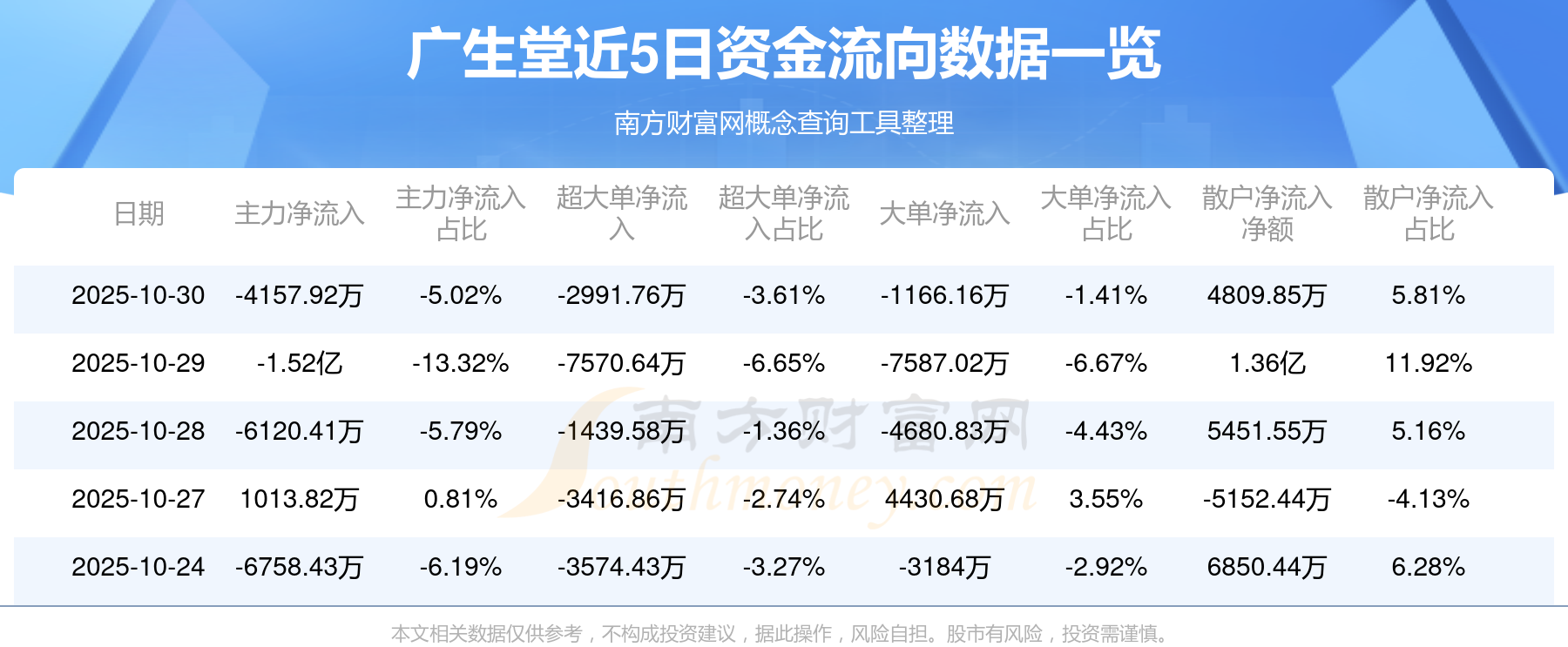 10月30日消息,广生堂主力资金净流出4157.92万元,超大单资金净流出2991.76万元,散户资金净流入4809.85万元。