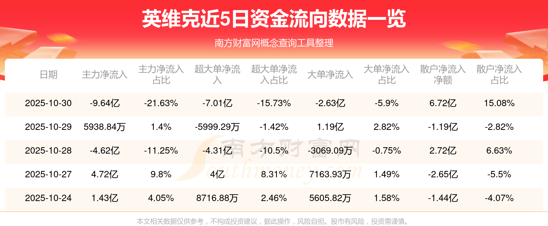 10月30日消息,英维克主力净流出9.64亿元,超大单净流出7.01亿元,散户净流入6.72亿元。