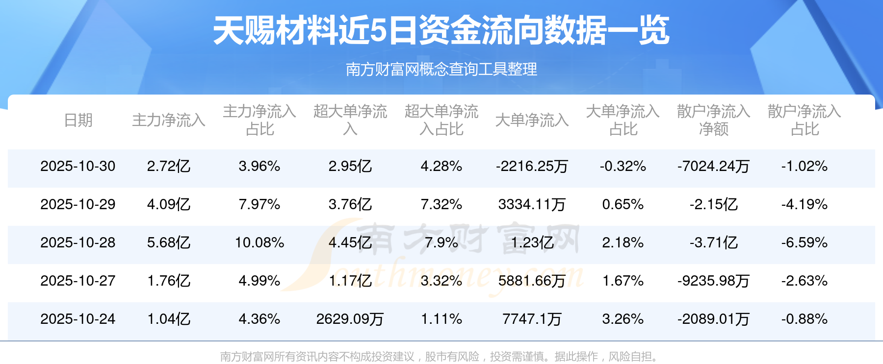 10月30日消息,天赐材料10月30日主力资金净流入2.72亿元,超大单资金净流入2.95亿元,大单资金净流出2216.25万元,散户资金净流出7024.24万元。