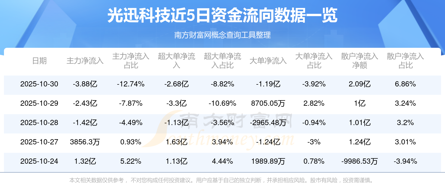 10月30日消息,光迅科技主力净流出3.88亿元,超大单净流出2.68亿元,散户净流入2.09亿元。
