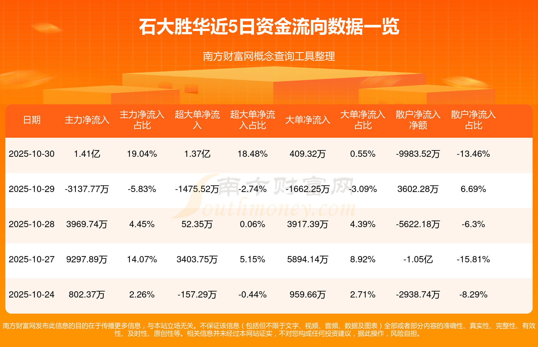 10月30日消息,石大胜华主力资金净流入1.41亿元,超大单资金净流入1.37亿元,散户资金净流出9983.52万元。
