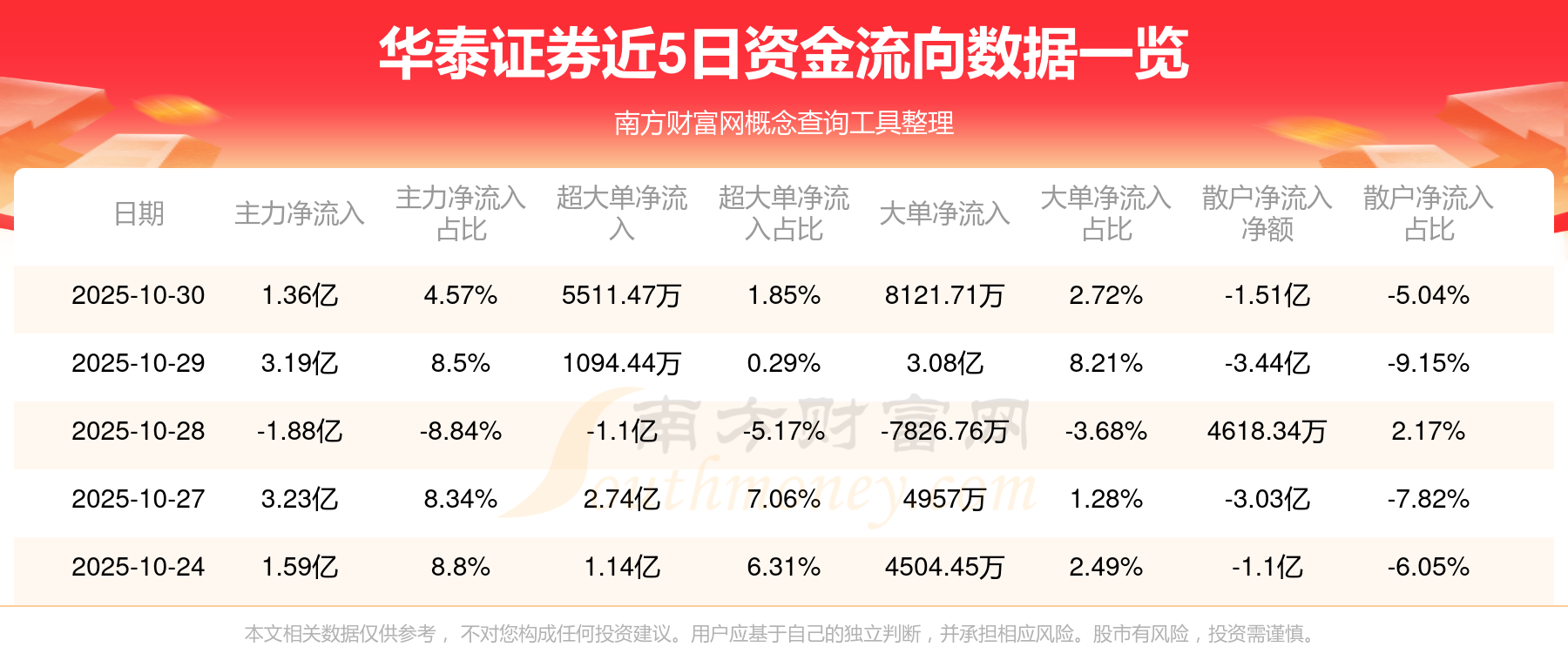 10月30日消息,华泰证券主力净流入1.36亿元,超大单净流入5511.47万元,散户净流出1.51亿元。