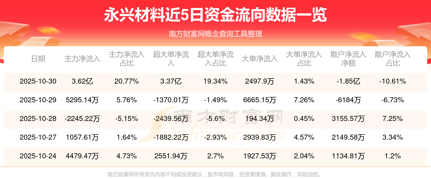 10月30日消息,永兴材料资金净流入3.62亿元,超大单资金净流入3.37亿元,换手率10.15%,成交金额17.45亿元。