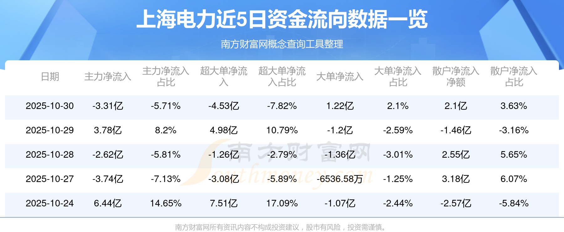 10月30日消息,上海电力10月30日主力净流出3.31亿元,超大单净流出4.53亿元,大单净流入1.22亿元,散户净流入2.1亿元。