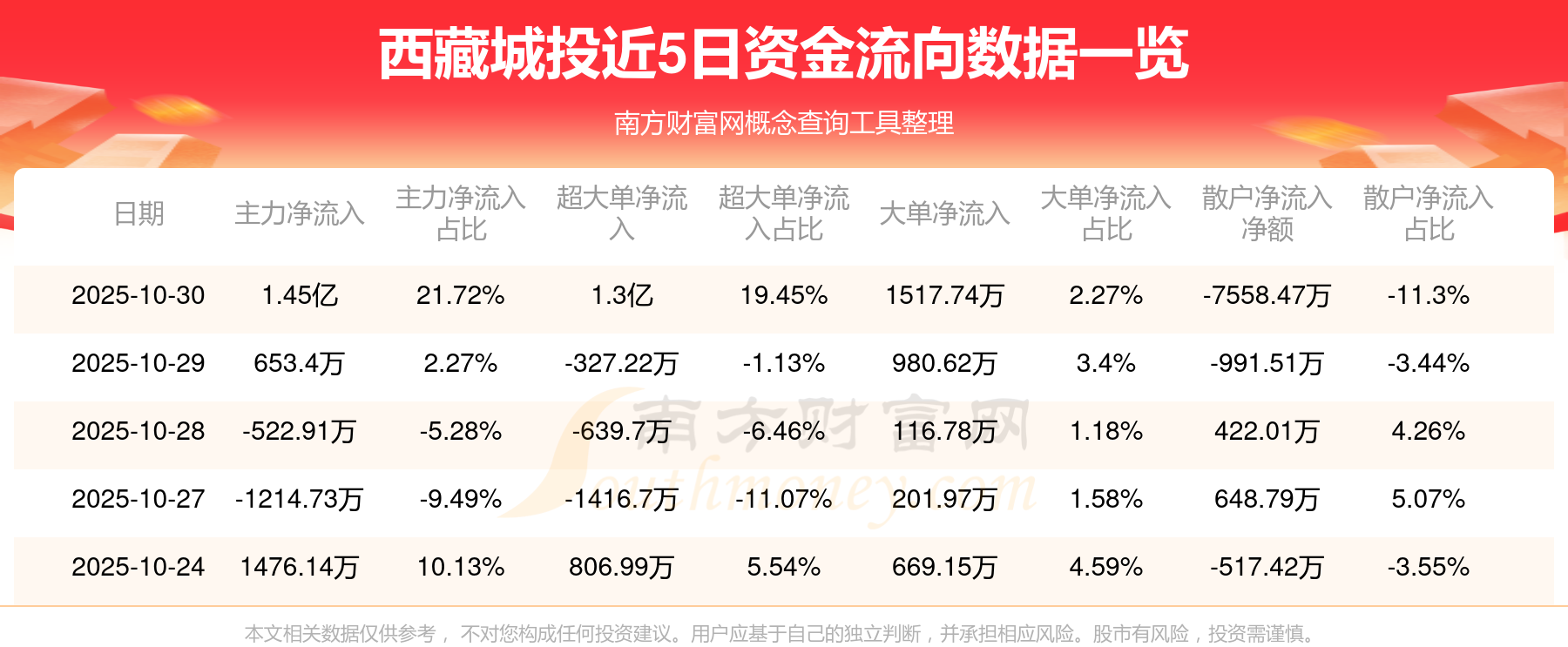 10月30日消息,西藏城投资金净流入1.45亿元,超大单资金净流入1.3亿元,换手率2.54%,成交金额2.99亿元。