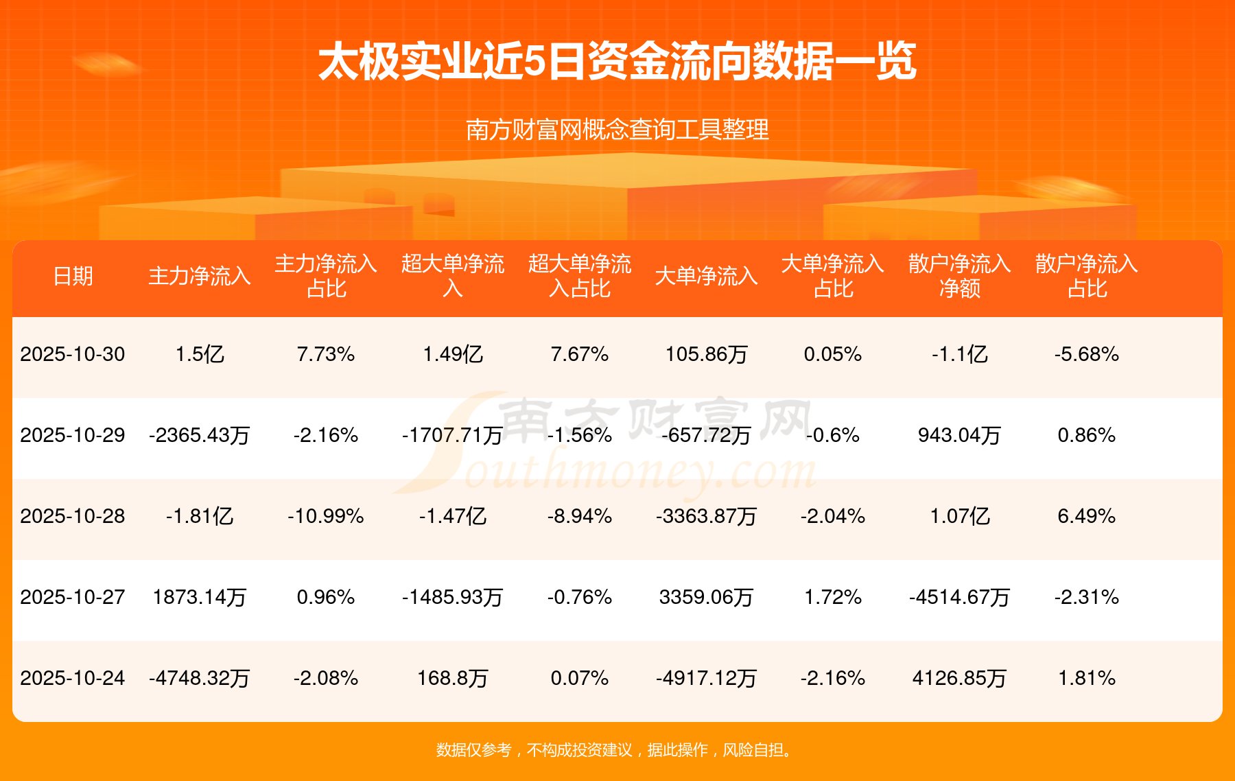 10月30日消息,太极实业10月30日主力资金净流入1.5亿元,超大单资金净流入1.49亿元,大单资金净流入105.86万元,散户资金净流出1.1亿元。