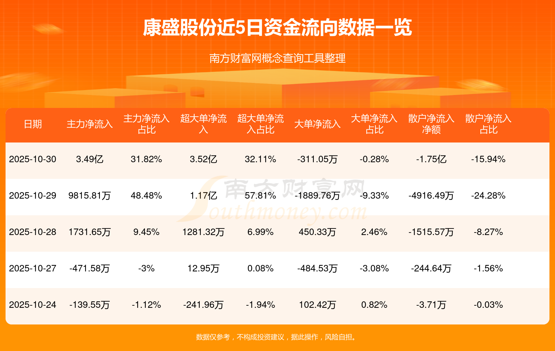 10月30日消息,康盛股份10月30日主力资金净流入3.49亿元,超大单资金净流入3.52亿元,大单资金净流出311.05万元,散户资金净流出1.75亿元。