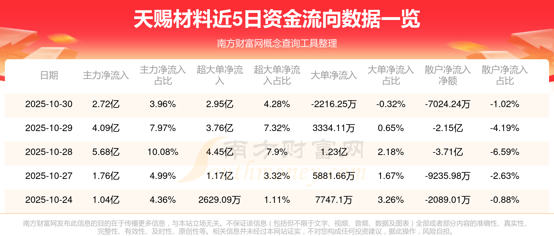 10月30日消息,天赐材料主力资金净流入2.72亿元,超大单资金净流入2.95亿元,散户资金净流出7024.24万元。