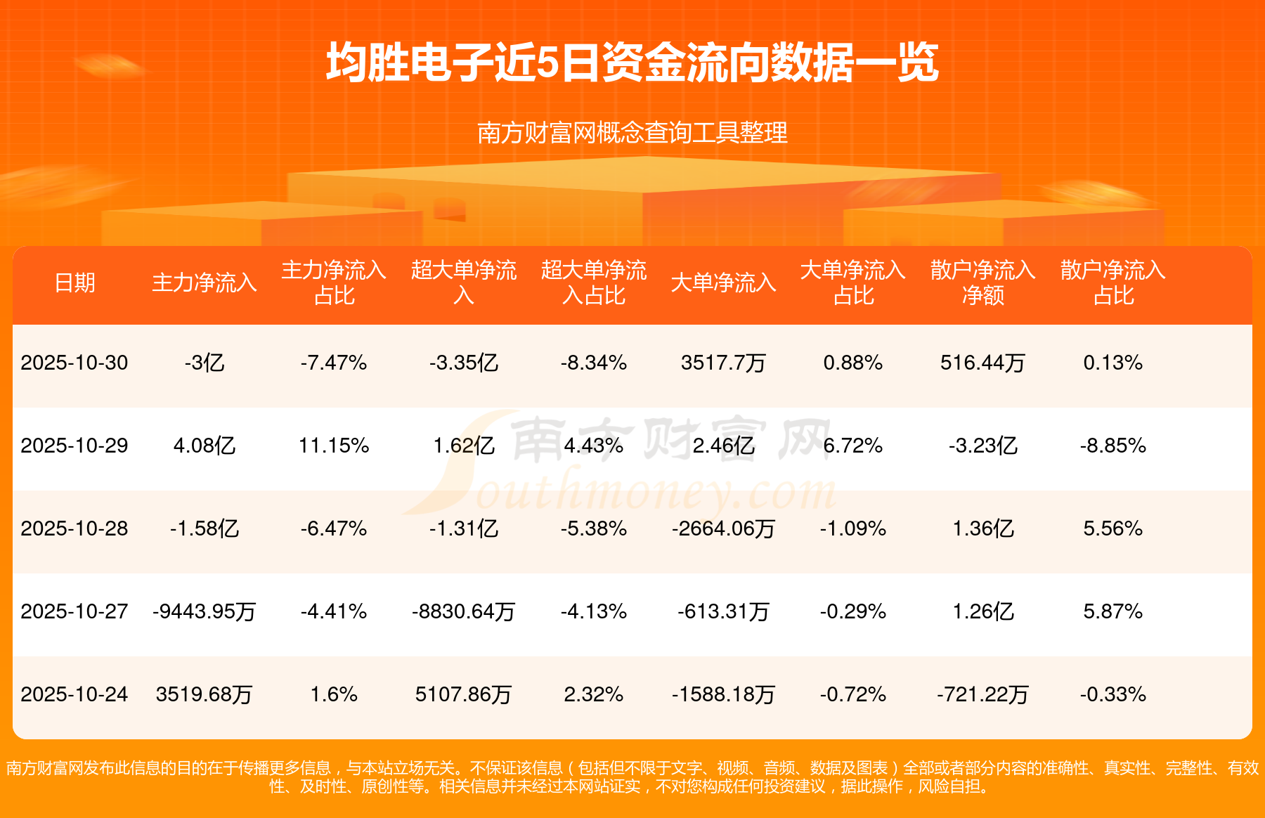 10月30日消息,均胜电子主力资金净流出3亿元,超大单资金净流出3.35亿元,散户资金净流入516.44万元。