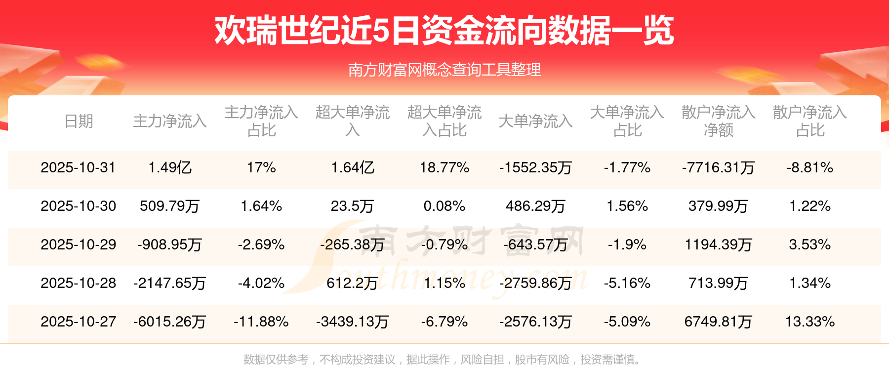 10月31日消息,欢瑞世纪10月31日主力资金净流入1.49亿元,超大单资金净流入1.64亿元,大单资金净流出1552.35万元,散户资金净流出7716.31万元。