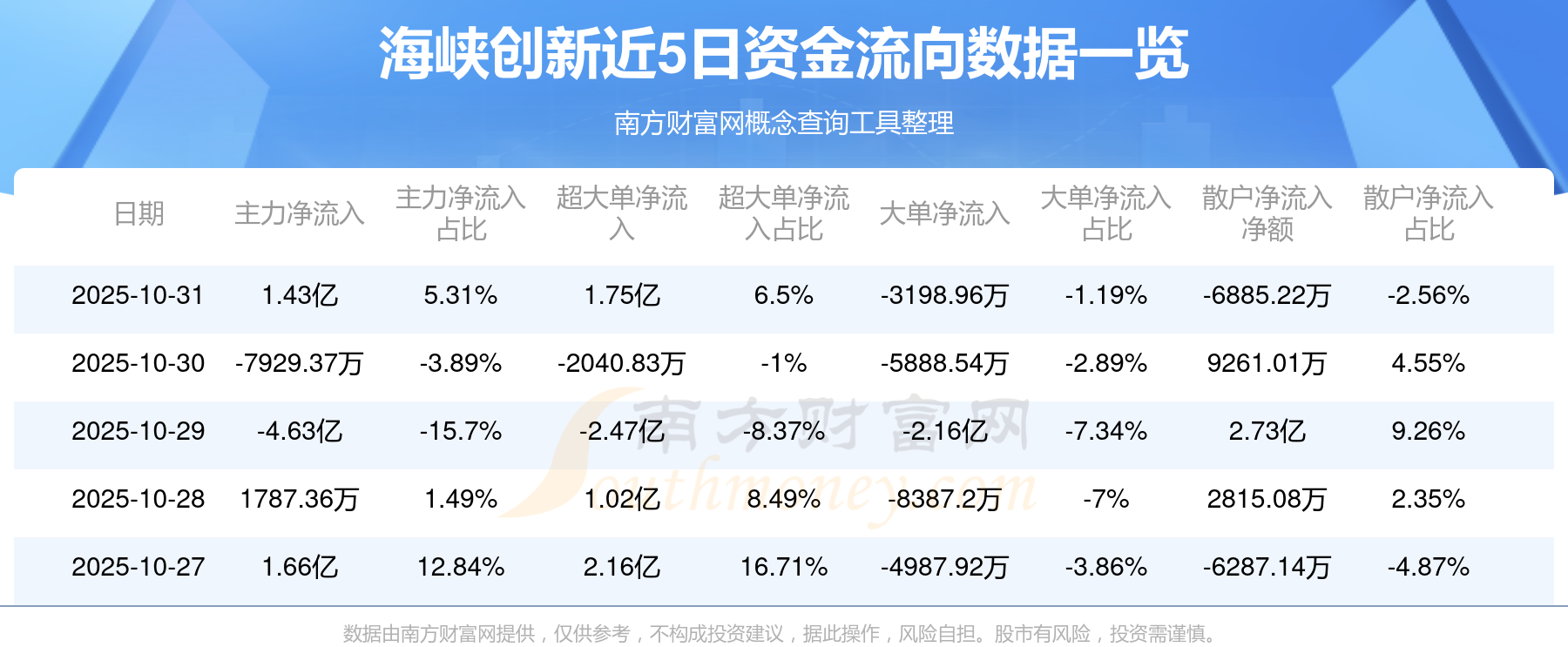 10月31日消息,海峡创新主力净流入1.43亿元,超大单净流入1.75亿元,散户净流出6885.22万元。