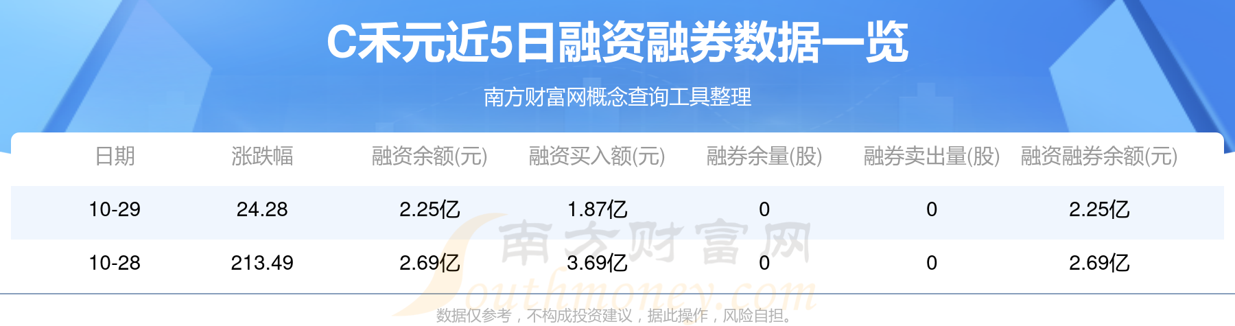 10月29日C禾元融券信息显示,融资方面,当日融资买入1.87亿元,融资偿还2.31亿元,融资净买额-4375.84万元。近5日融资融券数据一览见下表: