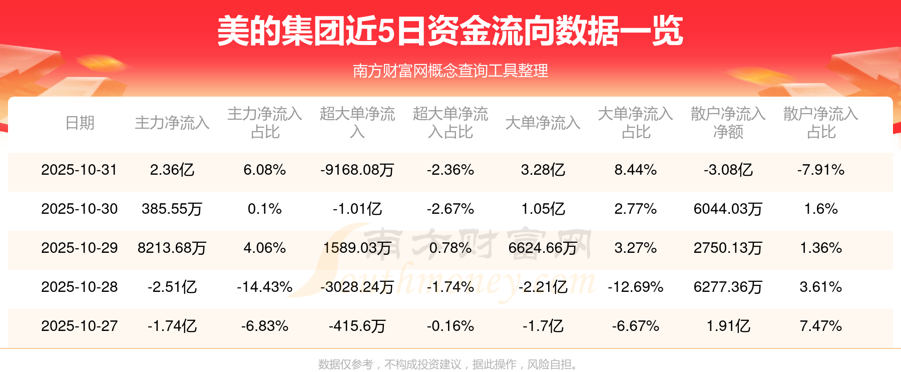 10月31日消息,美的集团主力净流入2.36亿元,超大单净流出9168.08万元,散户净流出3.08亿元。