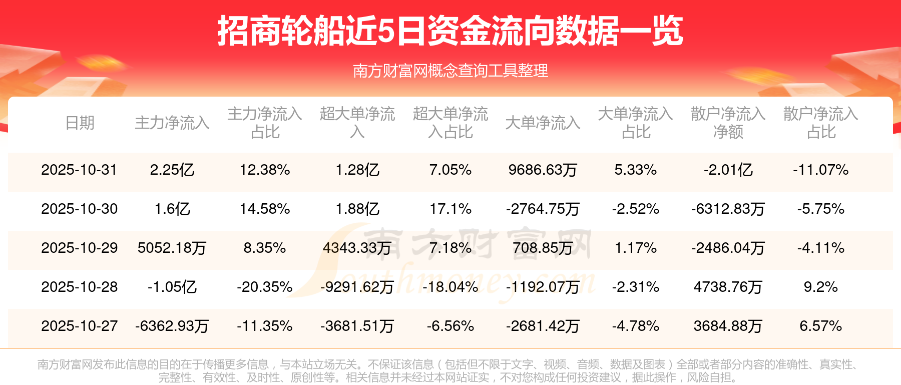 10月31日消息,招商轮船10月31日主力资金净流入2.25亿元,超大单资金净流入1.28亿元,大单资金净流入9686.63万元,散户资金净流出2.01亿元。